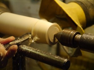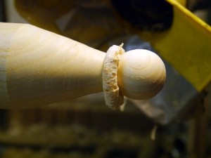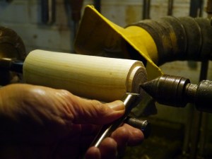 Now for the tricky bit. With a small skew (I used a round one) start a planing cut from the wide part of the cylinder towards the neck. As you approach the neck, bring the lower point of the skew into contact with the cylinder, keep the pressure on and keep going. (Pic 4)