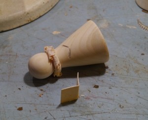 All that’s left to do is to score and fold a thin sheet of wood for the hymn book and attach it. In the spirit of re-cycling, I use material from the rim of the wooden boxes in which Camembert is packed. Card will do but I like the wood as well as cheese. Grooves are cut in the cone body with a craft knife and the hymn book glued on with superglue.