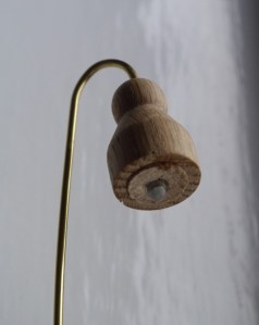 Drill a hole for the lantern pole at a suitable angle. I used a piece of brass tube 0.1” OD for the pole from a local model shop. You have to be careful bending it as it is likely to collapse. I turned a wooden cylinder with a groove around it to suit the tube and bent it by hand in the groove which supported it to stop it collapsing. Cut the tube to length, de-burr the ends and tin the outside of both ends with solder for attachment of wires. A wire inside the tube conducts current to the LED, the tube itself is the return conductor.