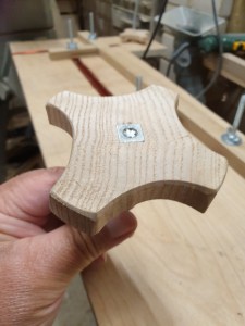 To make the tightening handles on top I turned a piece of wood into a T shape with the top of the T being big enough to fit comfortably in my hand and then cut 4 scallops into this to give me a good grip. I drilled a 6mm clearance hole in this and at the top fitted a captivated spiked T nut to allow me to screw this down and tighten my table to the bed of the lathe.