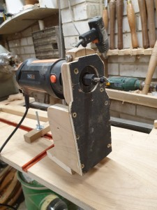 I am on about mark 3 of this as I found the first time, I had massively over engineered this making it too big and bulky to be used effectively. I started by making a simple three-sided box with a sturdy base. I already had a small palm router which I used for the actual fluting, so to hold this securely I turned a piece of Beech which was a nice tight fit over the nose of the router I then took this to the band saw to cut through one side and cut 2 flats to enable me to fit a nut and bolt through this which enabled me to tighten it further ensuring there was no movement in the router. As I have not made any allowances for any vertical adjustment it is imperative that the router is fitted exactly on the centre line. This is achieved quite simply by using a revolving centre in the tail stock to scribe a line in the face plate of your carrier, then drilling a hole allowing the cutter to poke through. I then put 2 screws through the face plate of the carrier and into the beech ring holding it all secure.