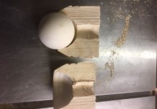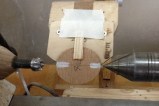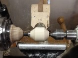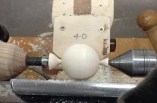 However, there are other methods which will, with care, result in pretty good spheres. Probably the most common technique is the template system. A hole is cut into thin plywood ideally turned on the lathe to the required diameter, is then cut to a crescent, not quite a semicircle, which is then used as a guide over the revolving blank between centres. The sphere is then shaped until the template is a perfect fit over the top with two small remaining spigots where it is held between the centres. The big drawback with this method is the need to keep having to release the gauge, pick up the template, and offer it to the work piece, over and over again.