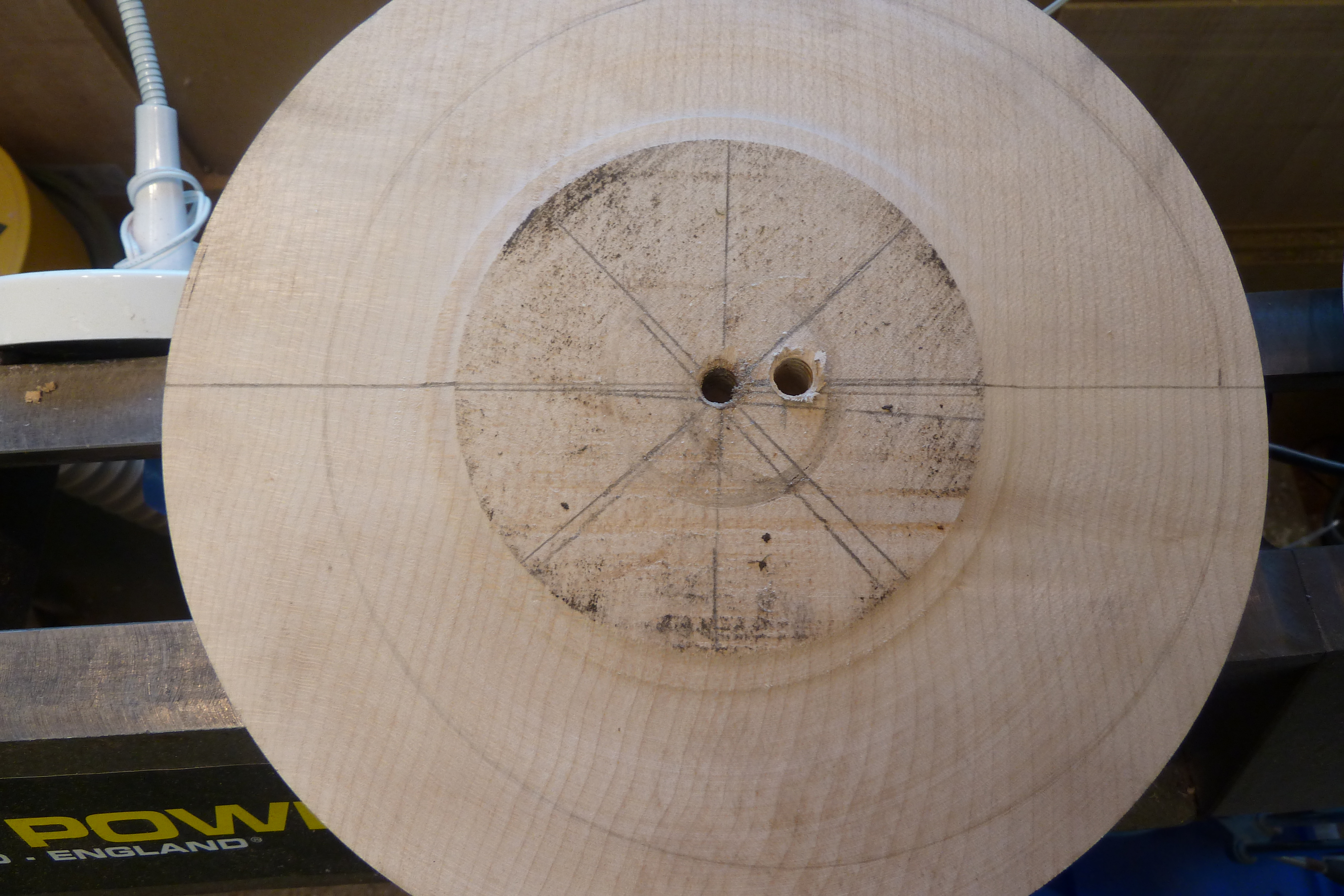 get the outside diameter of each bowl the same. The second hole was drilled an inch off centre – this was to create the off-centre inside – remember both bowl blank must have exactly (not nearly) the same distance between the holes – this is the first measurement that is critical.