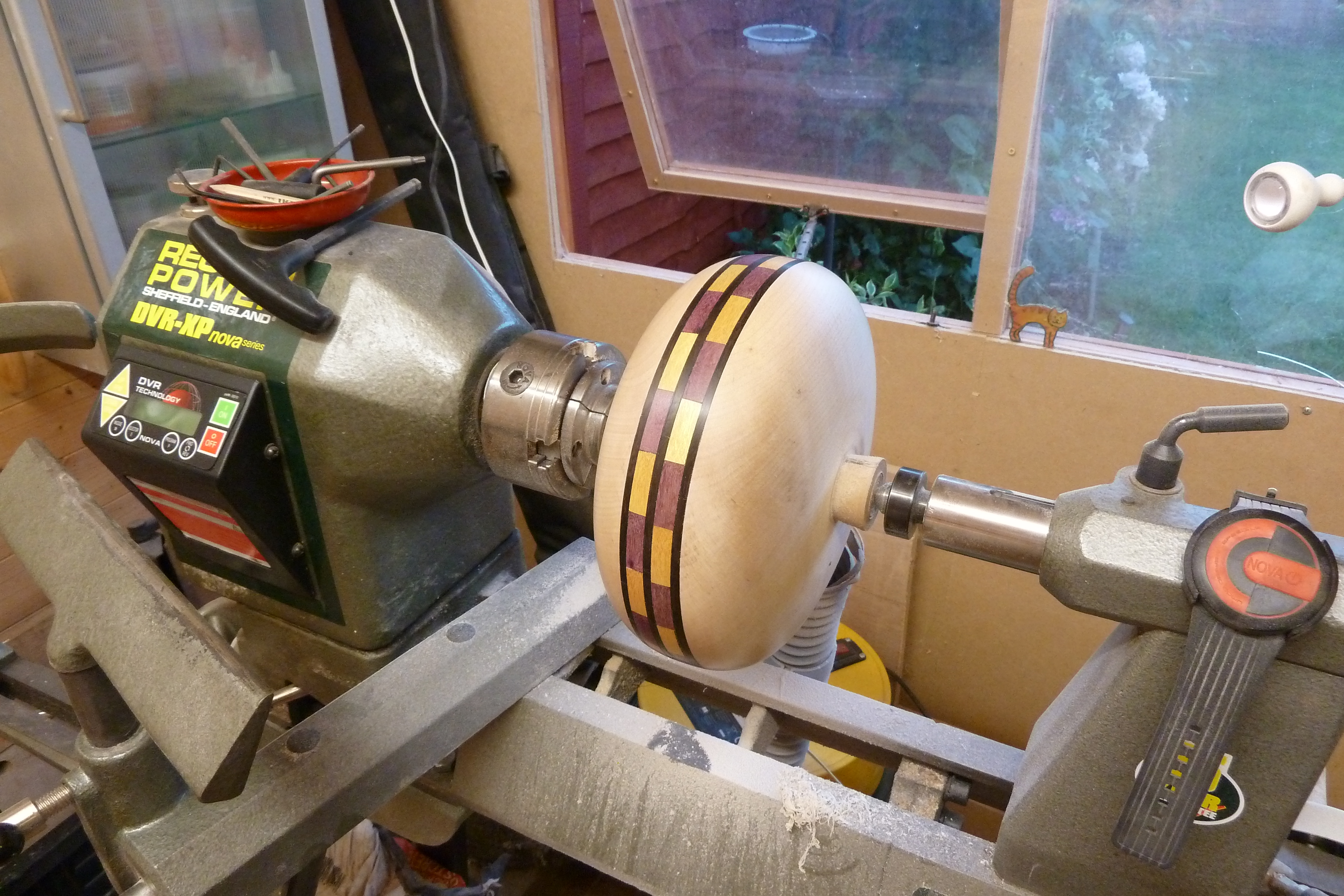 Once that was done I mounted both bowls onto the lathe in their final configuration. You must ensure the “top” or thinnest part of each bowl is aligned to ensure the bowls are symetrical. Also note the thickness of the bowl wall at the thinnest point. You will need to ensure you do not cut away too much of the external diameter of the bowls in the shaping.