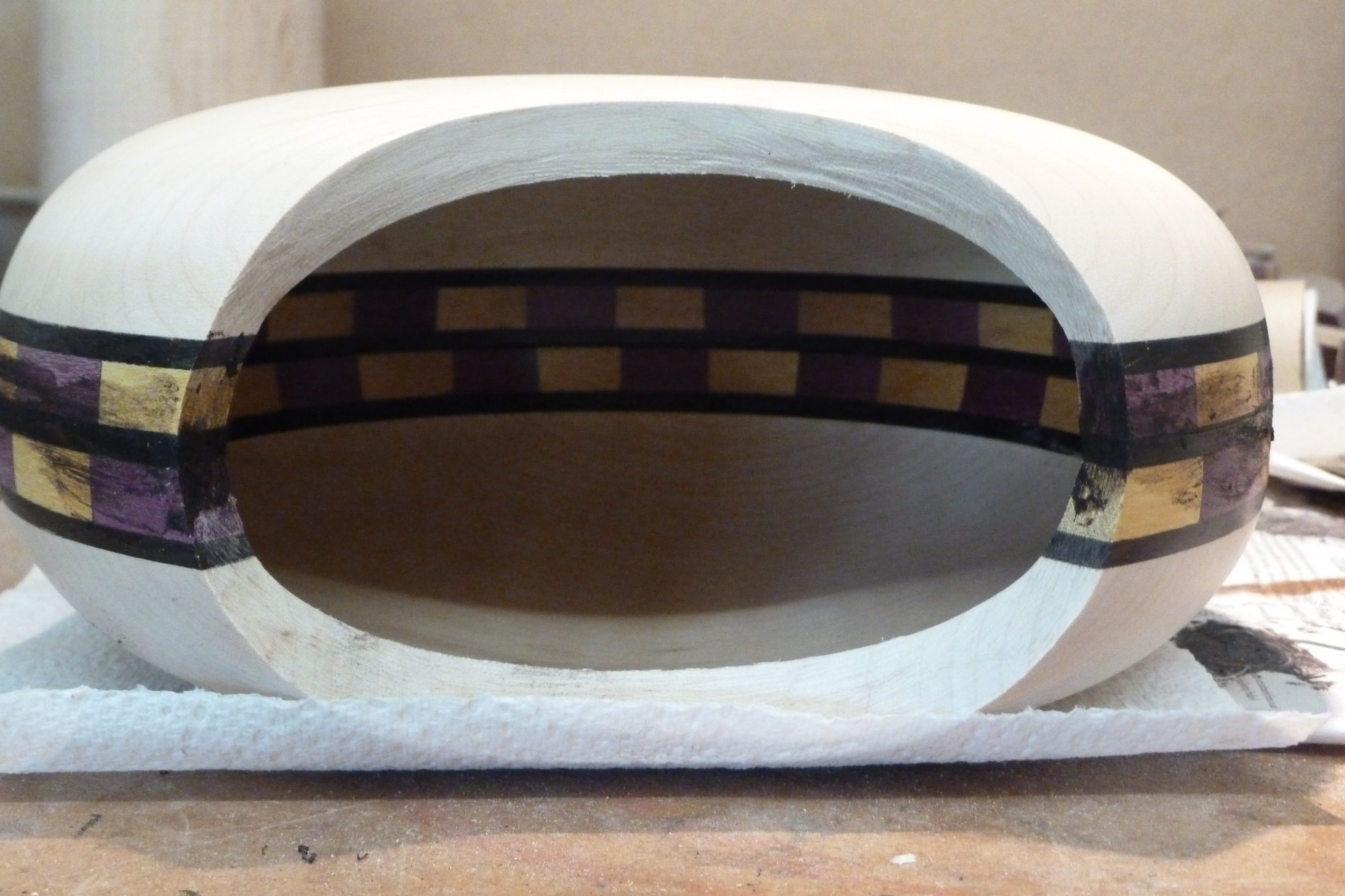 Once this was done I was able to reverse the bowls and focus on the inside. Before I started to hollow out the inside of the bowls, I wanted to creat the segmented rims. This was so the line of the inside of the bowl would be seamless when cutting it out later. As you can see from the picture below, you need to think of the final inside space and cut the segments accordingly to cover the bowl wall. I simply drew the inside diameter of the bowl with a pencil when it was on the lathe. I built up a layer of blackwood, then purpleheart/lemonwod and then a final layer of blackwood on each bowl. As the final form is going to have the 2 bowls glued together you must remember to offset/reverse the sequence of the purpleheart/lemonwood on each bowl to achieve the checkered effect. Also use where the segments join to mark the “top” of the bowls where the wall thickness is going to be at it’s thinnest. Draw a line between the 2 screw chuck holes to ensure you know where that is.